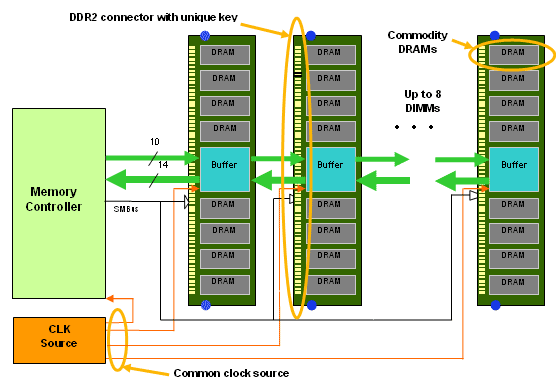 - 老实说FB-DIMM的原理与Rambus的RDRAM相近,主要差别只在FB-DIMM是以相容现有DRAM颗粒的方式来实现,以此规避技术专利,但就成本与简化性而言,反而是RDRAM较有利。