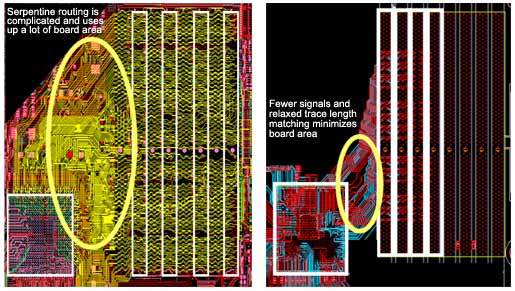 图左为一个DDR2 Registered DIMM通道的布线图,图右则为二个FB-DIMM通道的布线图