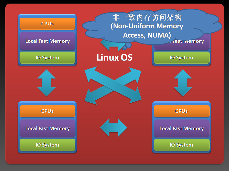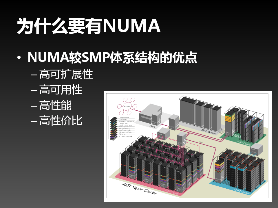 这是为了解决SMP各种缺点的一种架构,NUMA。介于SMP和Cluster之间。