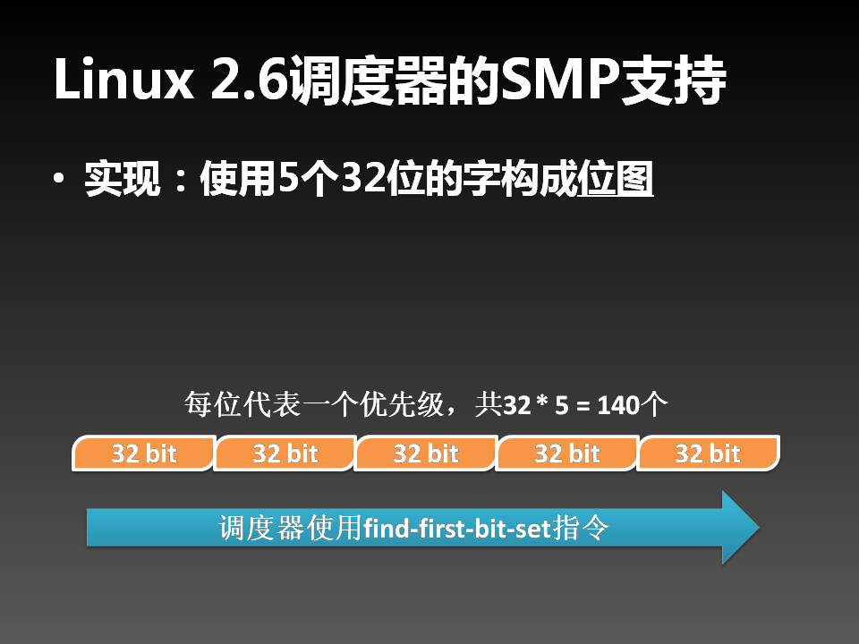 Linux使用5个32位字构成位图,组织140个优先级(末20个浪费)。