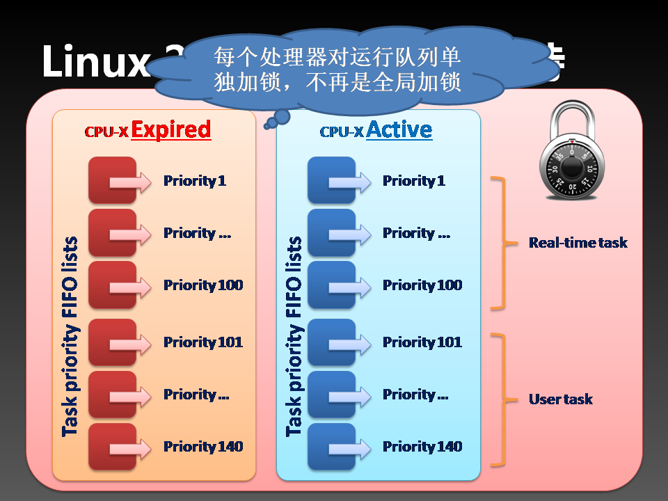 某CPU进行调度时,只需要锁两个运行队列即可,而不是整个内核。