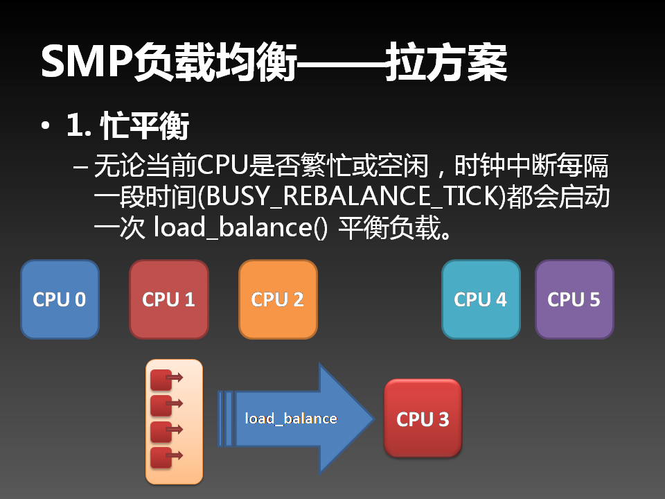 SMP调度器可以进行负载均衡。拉方案是把其他处理机上的任务平衡到本处理机。